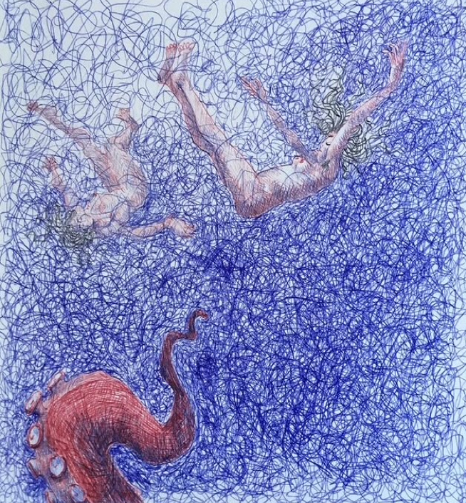 Ces fonds qui me hantent, Delphine Denis, dessin au bic, 20×20 cm, 2024